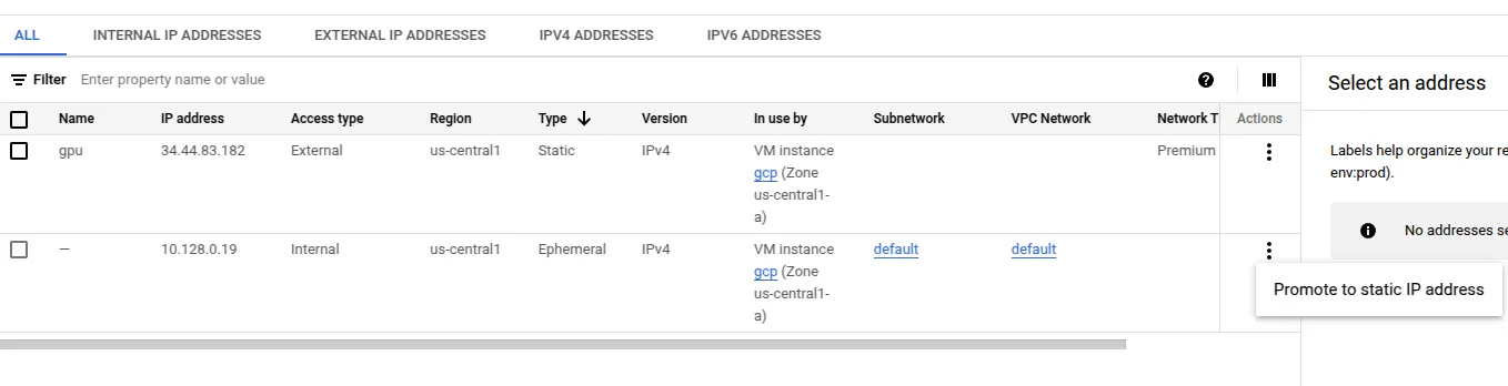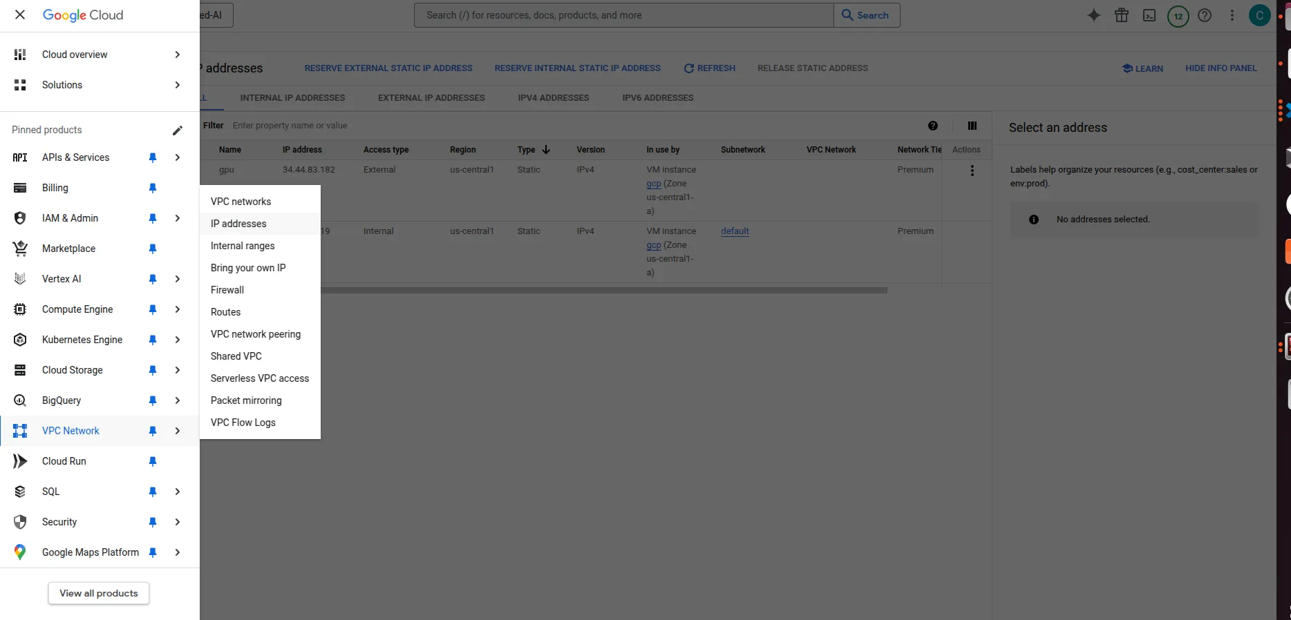 GCP 콘솔 좌측 메뉴에서 VPC Network → IP address 로 이동하면 현재 프로젝트에서 사용 중인 외부 IP 주소 목록을 확인할 수 있다.