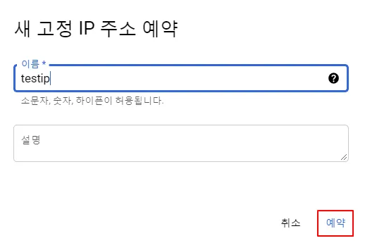 확인 후 저장하면, 해당 IP는 정적인 IP로 전환되며, 인스턴스가 재시작되더라도 IP가 변경되지 않는다.