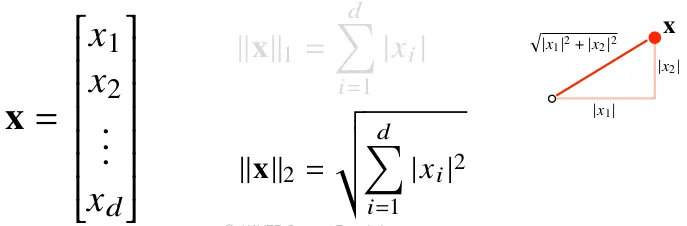 - $\|\mathbf{x}\|1 = \sum{i=1}^{d} |x_i|$