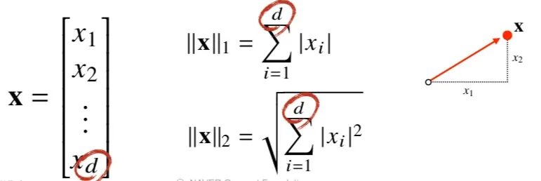 - 벡터의 노름(norm)은 원점에서부터의 거리