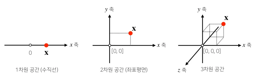 - 벡터가 갖는 원소 수 𝑑 를 차원이라고 함