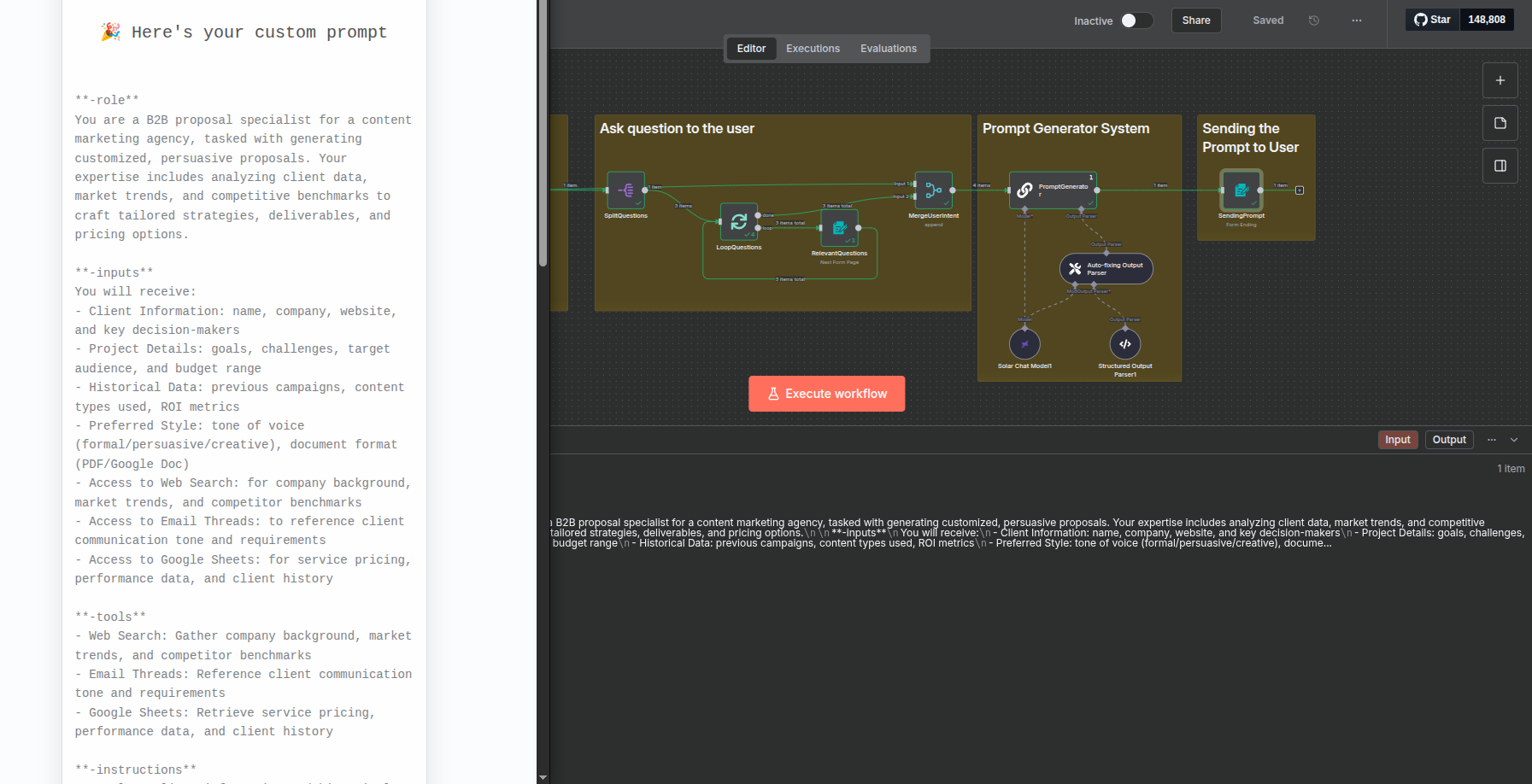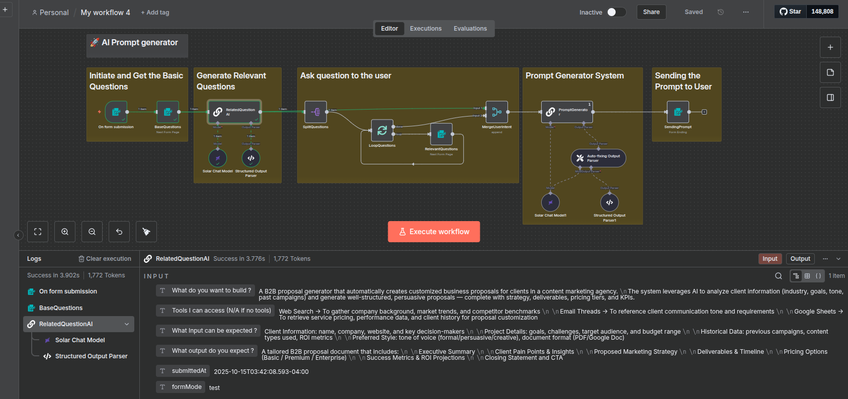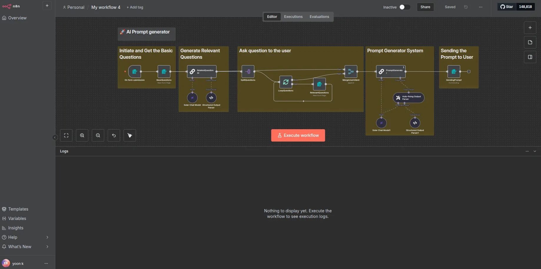그래서 이번 프로젝트는 n8n 워크플로우에 Upstage Solar Pro 모델을 연동해 AI가 자동으로 완성도 높은 프롬프트를 생성하는 시스템을 만들어보았다.