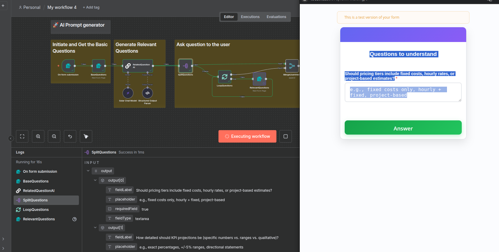 폼을 제출하면 On form submission 트리거가 활성화되어 입력 데이터를 Solar Chat Model로 전달한다.