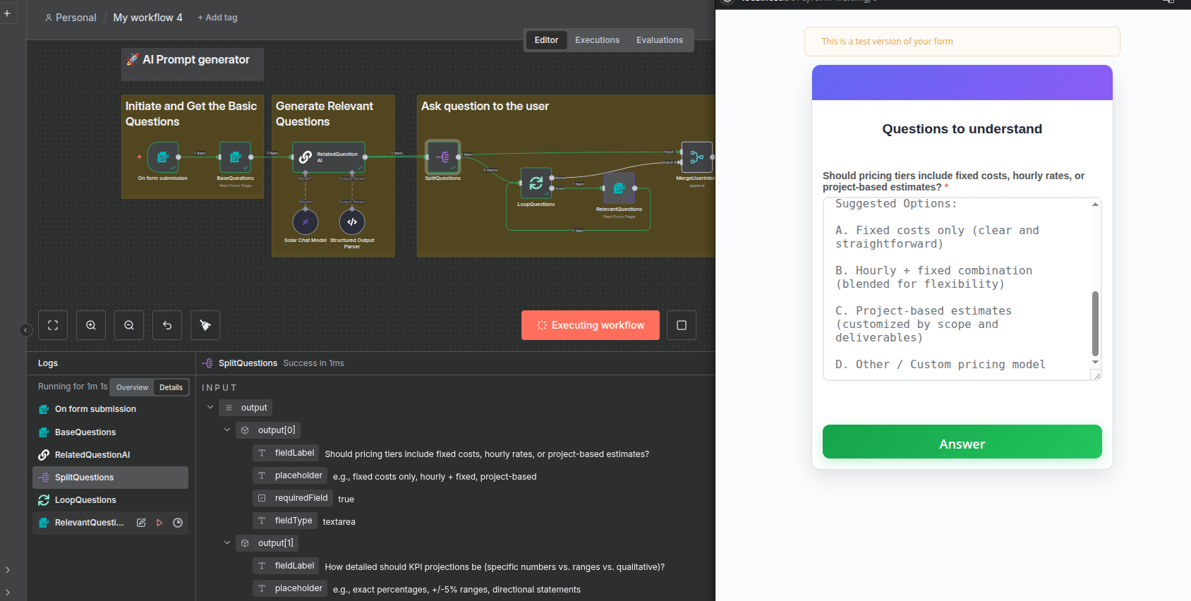 Solar 모델의 Structured Output Parser가 이를 JSON 배열로 변환해 다음 단계(SplitQuestions)로 넘긴다.